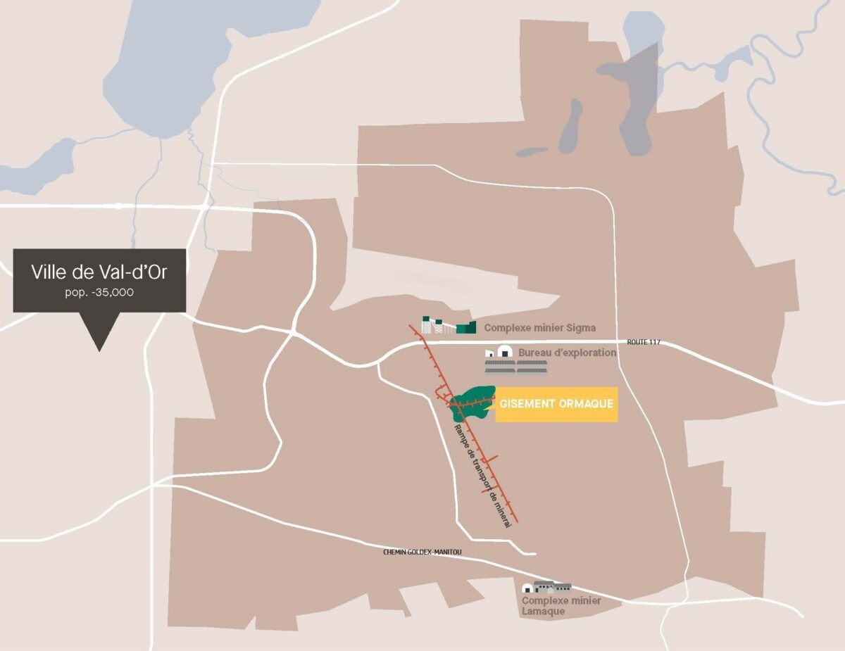 Découvert en 2019, le gisement Ormaque est situé à 1,1 km au sud-est de l’usine, sous le secteur nord-est de l’ancien parc à résidus Lamaque. Accessible via la galerie d’exploration depuis la rampe souterraine de transport de minerai, les travailleurs utiliseront le portail Sigma (côté usine) pour y accéder. Notre société possède toutes les autorisations nécessaires pour ces travaux.